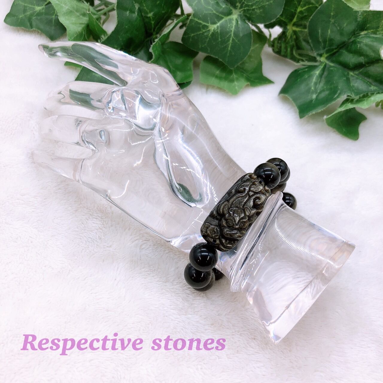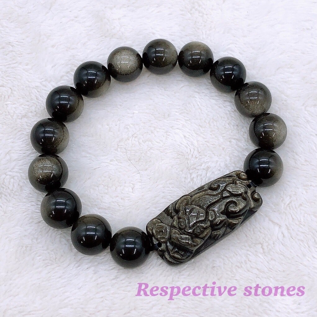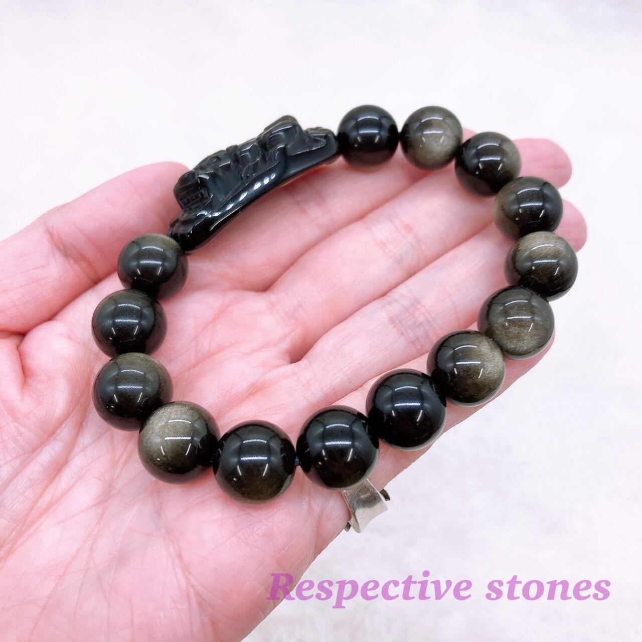 独特なゴールドの輝きが美しいゴールデンオブシディアンにヒキュウを彫り込んだ珍しいブレスレットです☆彡