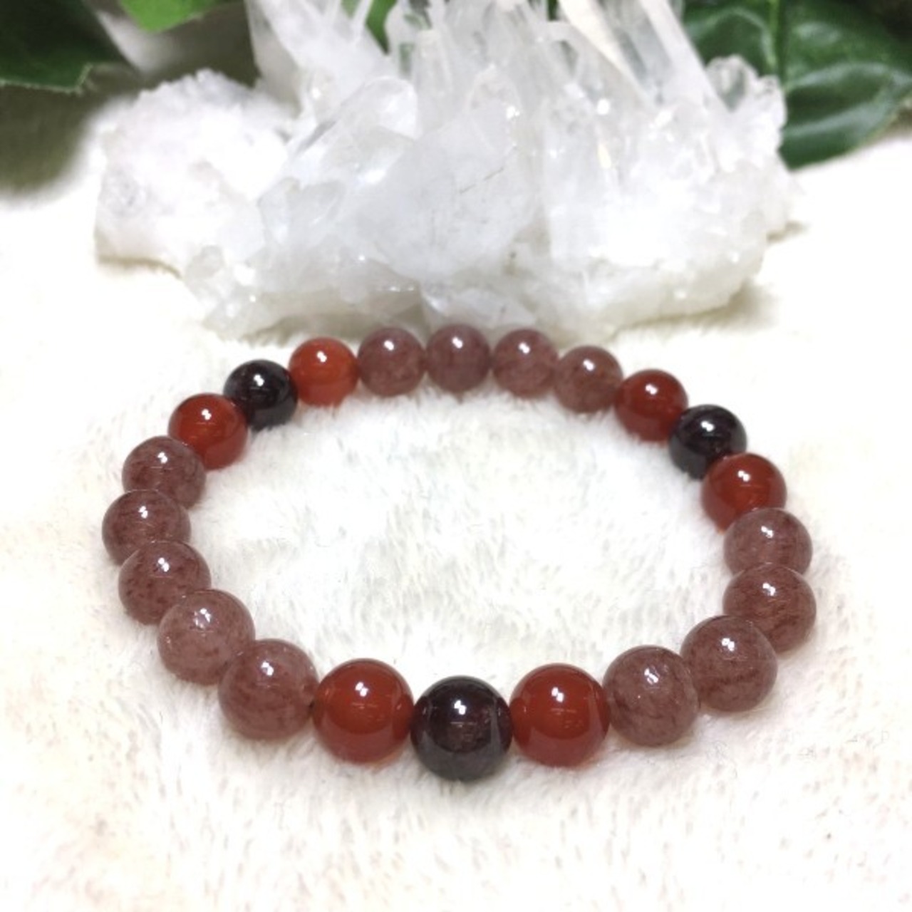 またモスコバイトには夫婦円満、赤めのうには子宝のお守りのエネルギーがあるので子宝ブレスとしてもいいと思います。