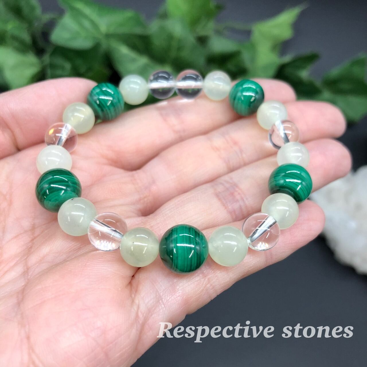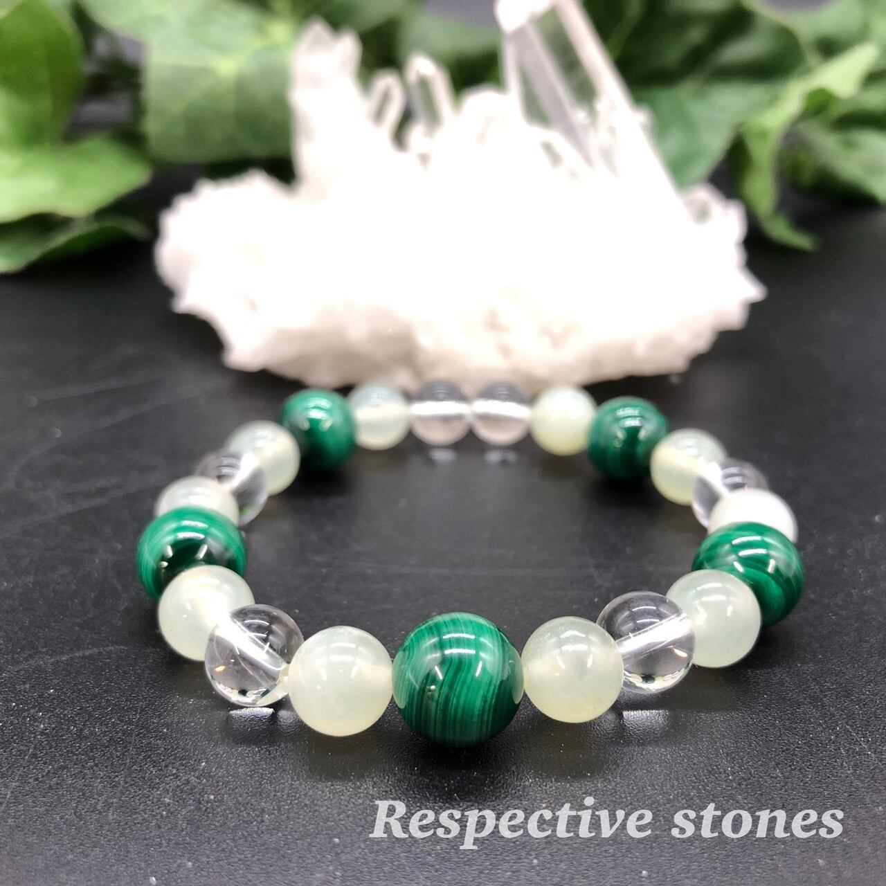 厄除けのエネルギーを持ったマラカイトとニュージェイド(サーペンティン)を使ったグリーン系のブレスレット(ゴムタイプ)です。