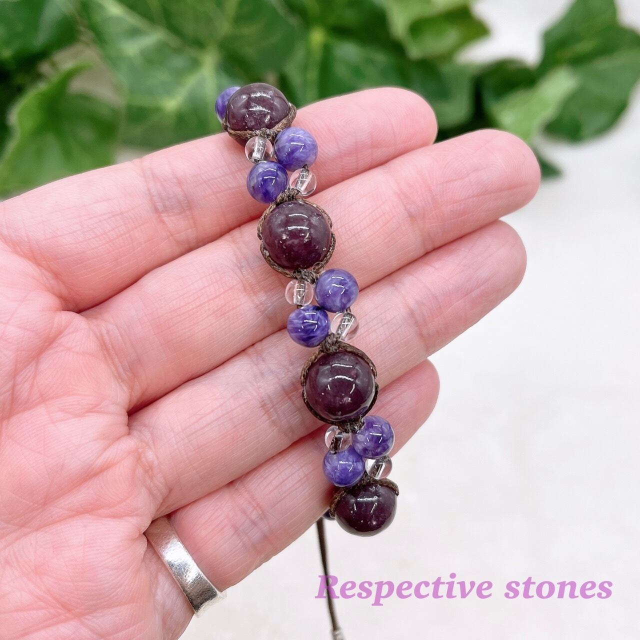 レピドライトとチャロアイトを使ったパープル系のひも編みブレスレットです。