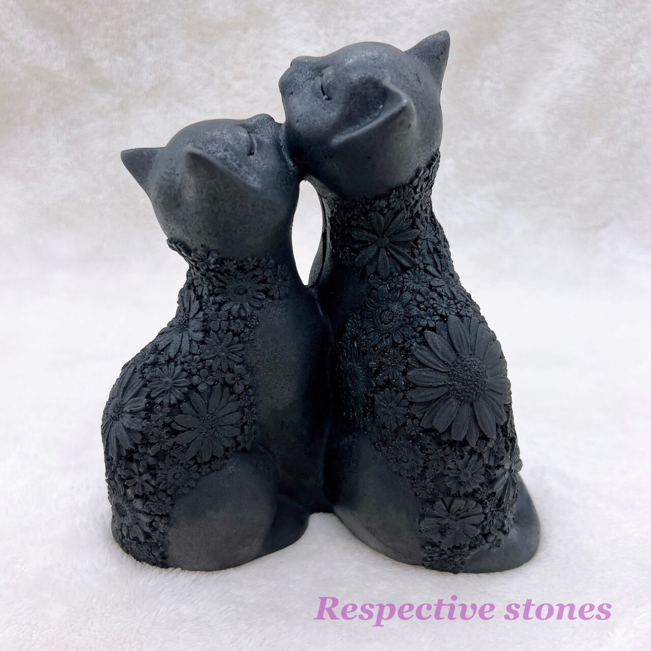 2匹とも穏やかな表情で、背面に彫刻された咲き誇る花が華やかさをプラスしており、どの角度から見ても愛らしい置物となっております!シュンガイトはロシアのセレリア共和国オネガ湖周辺でしか産出されない希少な石です。