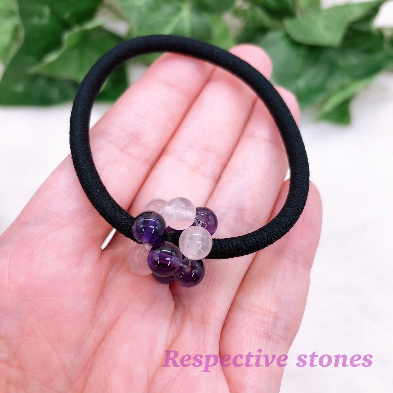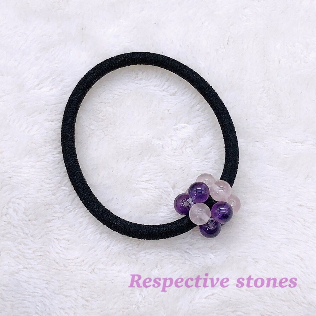 そんなヘアゴムに「パワーストーンを付けたい」というお客さまのリクエストがありましたので、5種類ご用意いたしました。