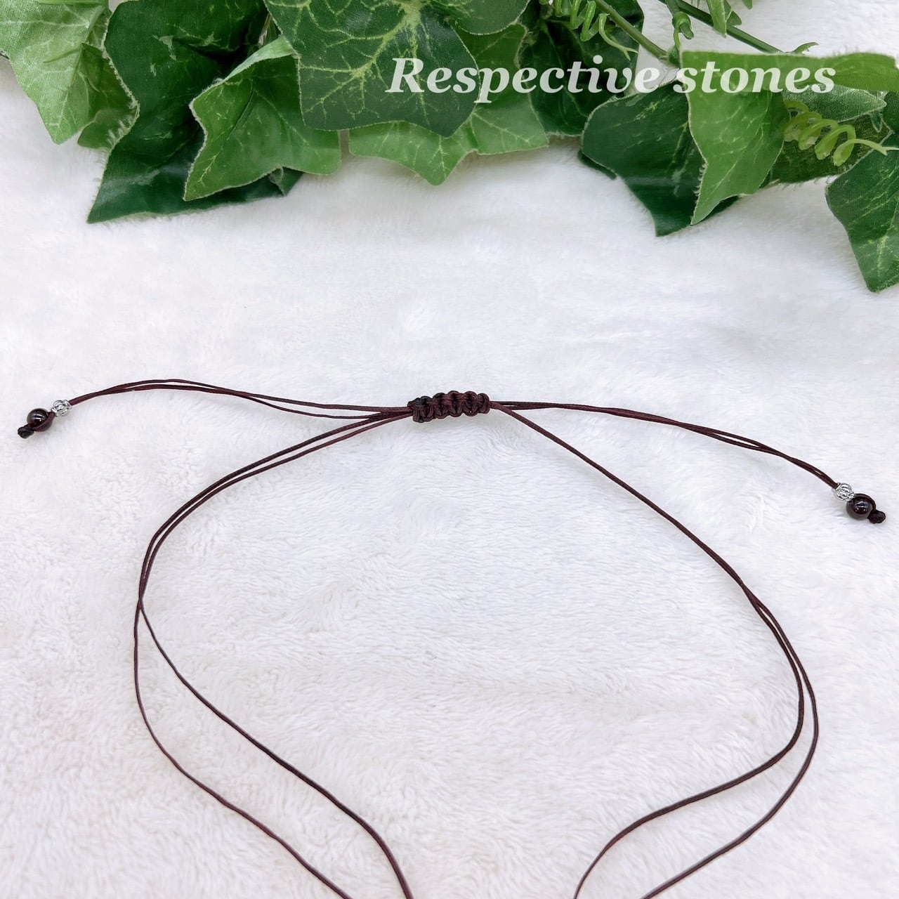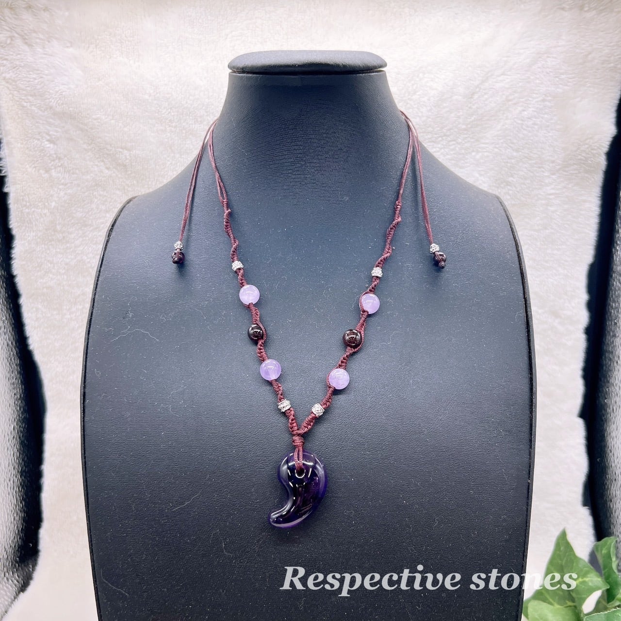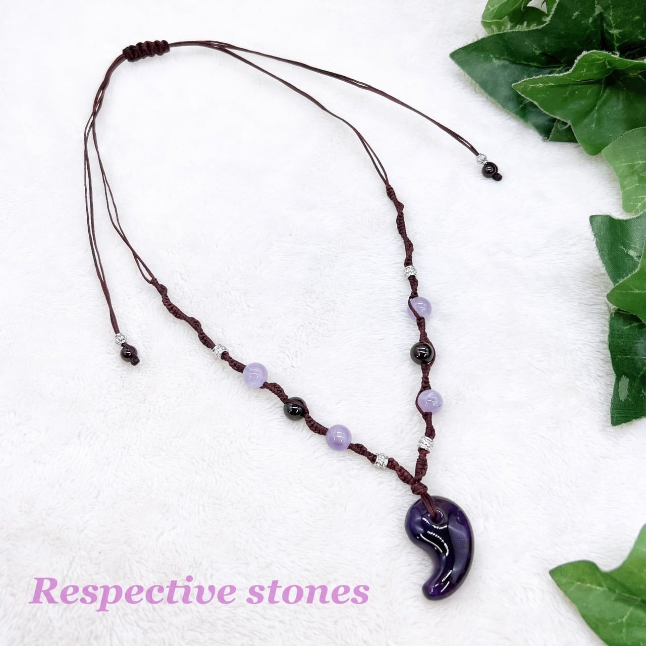 いろいろなシーンでサポートしてくれる「調和」のエネルギーを持つアメジストと「循環」のエネルギーを持つガーネットを使ってひも編みネックレスを組んでみました。