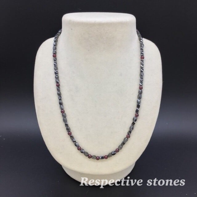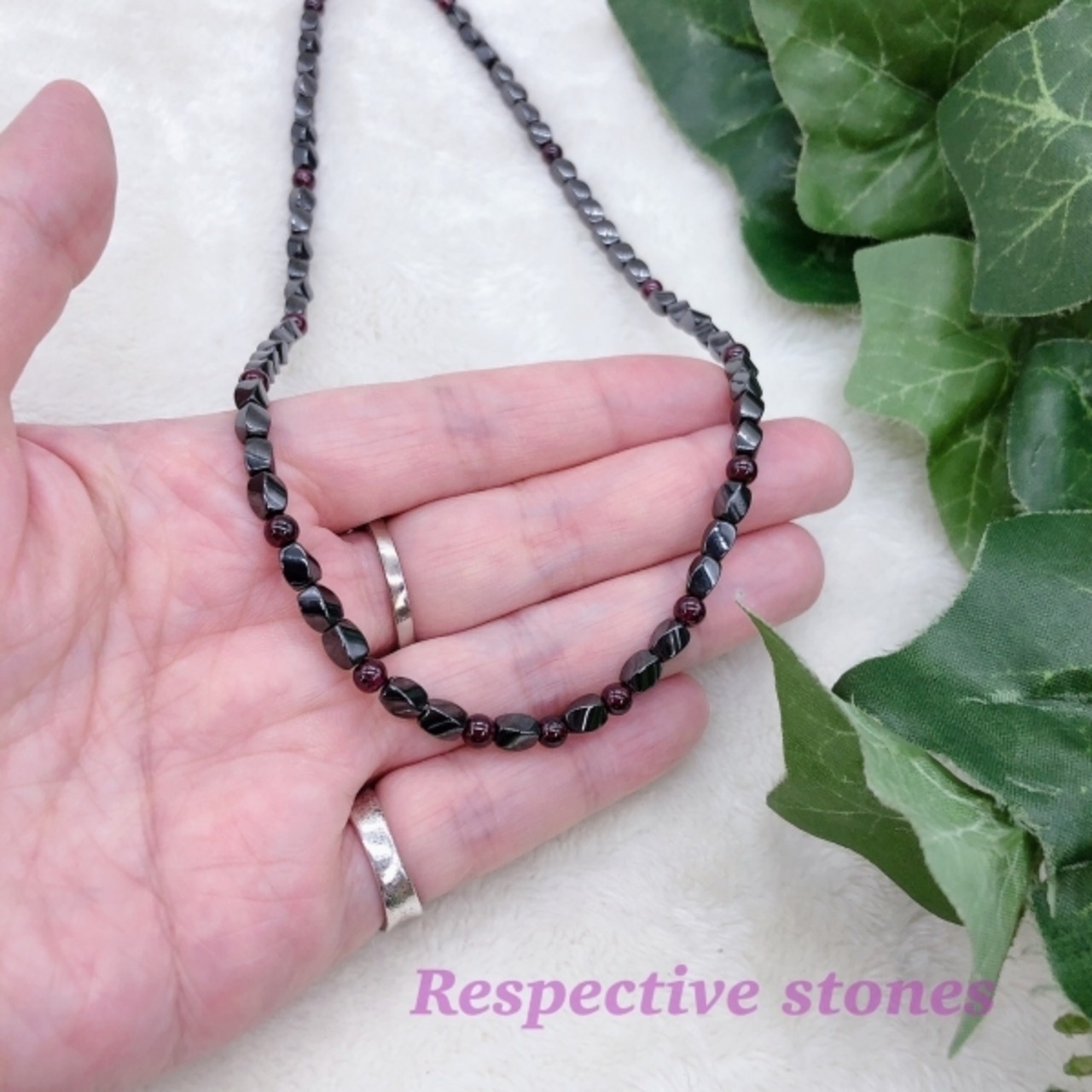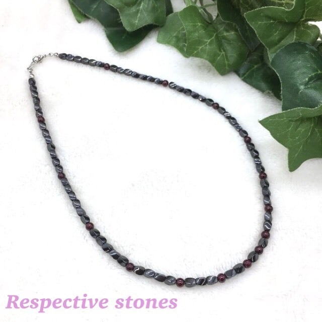 ツイストスクエア(3×5ミリサイズ)の磁気ヘマタイトと丸玉4ミリのガーネットを使ったネックレスです♪