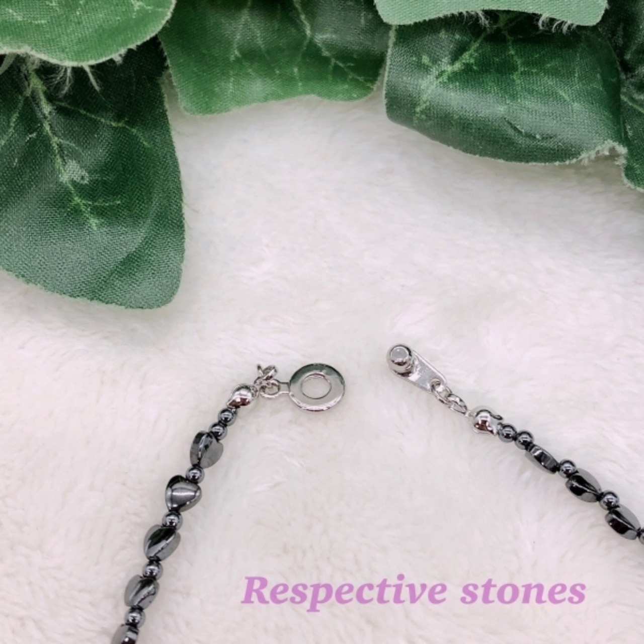 ハートとハートの間に2ミリのヘマタイトを使っています。