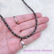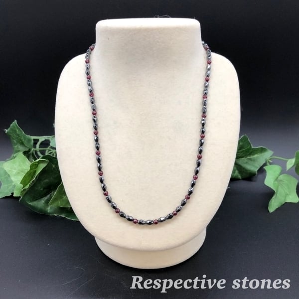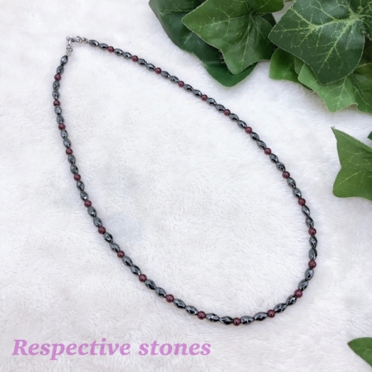 ライスカット(4×7ミリサイズ)の磁気ヘマタイトと丸玉4ミリのガーネットを使ったネックレスです♪