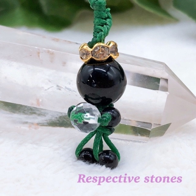 はじめまして♪ハッピーナ☆です! あなたのハッピーお手伝いしちゃいます。 おまもりとしてそばにおいてね☆ ハッピーナ☆に新しい仲間が増えました♪ モリオン(黒水晶)のハッピーナ☆が水晶のカット珠を抱っこしています。 モリオンといえば、パワーストーンの中で最も強力な邪気祓いの力を持つと言われている石です。 モリオンは、マイナスエネルギーから持ち主を強力に守ります。 また、強力な浄化作用を持つ石であり、不幸を寄せ付けないような強い邪気祓いのエネルギーを考えると、持ち主にとっては『幸運の石』と呼べるかもしれません。 今回は、黒水晶と水晶で”ダブル水晶”のおまもりです。 ●モリオン(ブラック) 強力な邪気祓い、魔よけ。マイナスエネルギーから持ち主を強力に守る。強力な浄化作用。強いグラウンディング効果。エネルギーの集中化。鬱、メランコリー状態を改善に導く。 ●水晶(クリア) 優れた浄化力。他の石のエネルギーを高める。免疫力を高める。魔よけ、厄よけ。開運。直観力を高める。自己成長。気の流れを安定させる。 ★ストラップの他、キーホルダーやチャームとして、バッグ、ポーチ、ペンケースなどにつけてもOK♪ お好きなところに使ってください。 ひもの色:グリーン 全体の長さ:約8cm(ひもの長さ:約4.5cm) ※商品は水晶クラスター・ホワイトセージで浄化したものをお届けいたします。